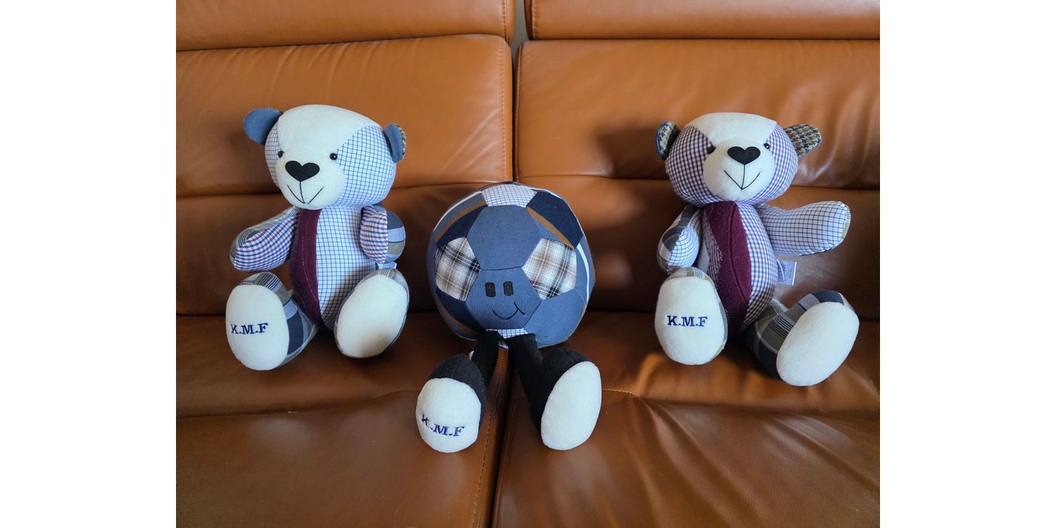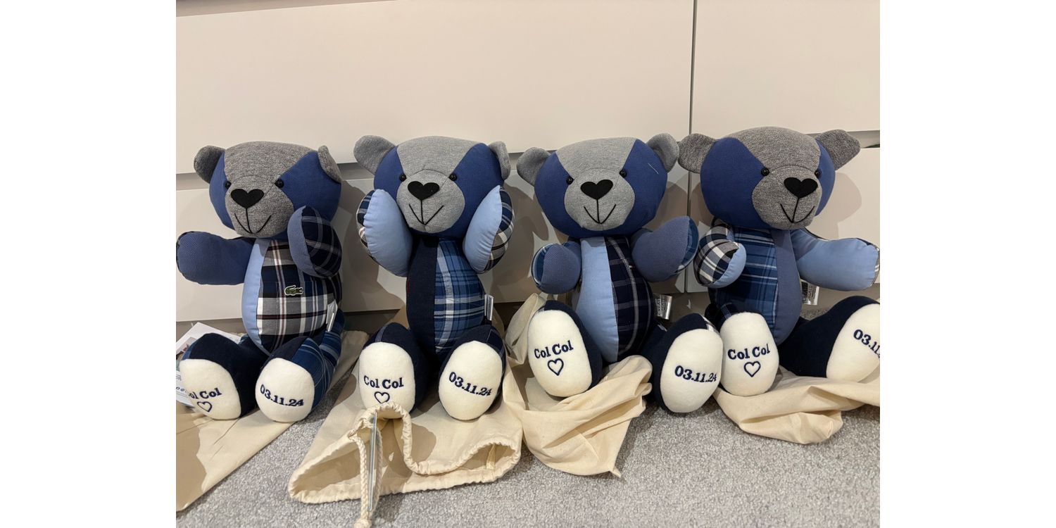 Lovingly handmade by our team we can create a memory bear from any clothes that you want to keep and treasure, such as baby grows, adult shirts, uniforms and more. Each bear will be a lasting reminder of those precious times and will quickly become one of your most beloved possessions.