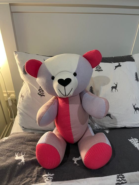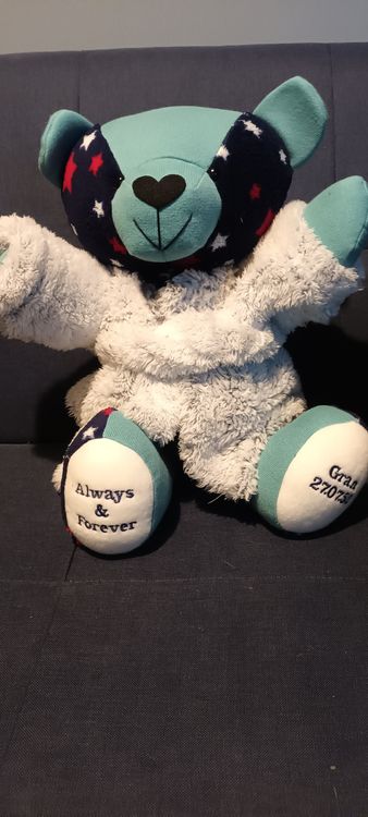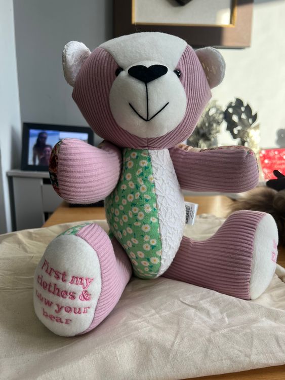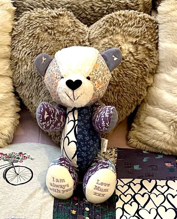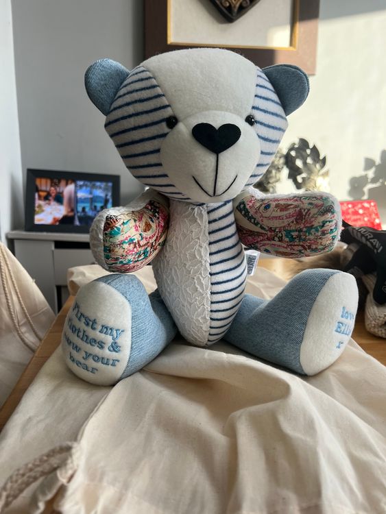 From placing the order to receiving the beautiful bear I cannot speak highly enough of this wonderful business. In what has been a difficult time of losing my beautiful mum a glimmer of light has been shone by receiving my beautiful memorial bear made from some of my mums special clothes that have huge sentimental value. The bear is lovingly made to a very high quality with beautiful buttons saying made with love fir each of the arm & leg joints. The tine frame provided was true to what it said. The bear arrived in its own cotton dust bag for extra protection. Lots of happy tears cane on opening my beautiful bear. I cannot thank the team enough for their beautiful work creative craftsmanship. Thank you from tje bottom of my heart 💕